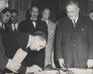 Tras jurar como ministro a de Agricultura, Tierras y Colonización, Alejandro Hales Jamarne firma su aceptación del cargo ante el presidente Carlos Ibáñez del Campo.