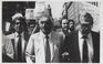 Acompañan a Alejandro Hales, Narciso Irureta, ex presidente de la Democracia Cristiana en 1965, y Luciano Valle, dirigente del Partido Socialista. Las pancartas que se ven en segundo plano son alusivas a la Agrupación de Familiares de Detenidos Desaparecidos y a Manuel Jesús Tamayo, dirigente soc ...[+]