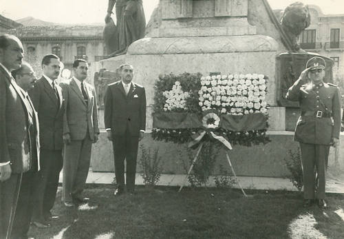 El embajador de Chile en Bolivia, Alejandro Hales en compañía de autoridades bolivianas participan en la ceremonia de entrega de una ofrenda floral al libertador Simón Bolivar en la ciudad de La Paz, Bolivia. 1958
