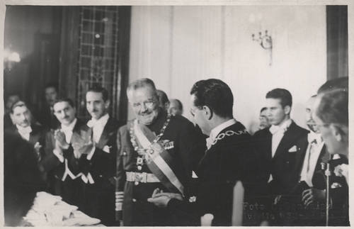 El embajador de Chile en Bolivia, Alejandro Hales, durante una ceremonia oficial de los presidentes de Bolivia, Víctor Paz Estenssoro y Chile, Carlos Ibáñez del Campo, durante la visita de este último a Bolivia. Este fue el primer viaje de Estado de un presidente chileno a ese país. Agosto 1955