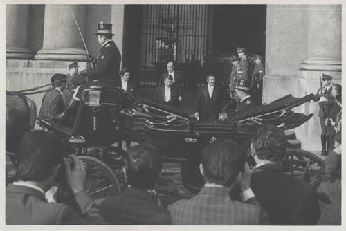 El ministro de Minería, Alejandro Hales, en las puertas del Palacio de La Moneda en su calidad de ministro miembro del Gabinete del Presidente Eduardo Frei Montalva. Lo acompaña Andrés Donoso, ministro de Vivienda. 1970