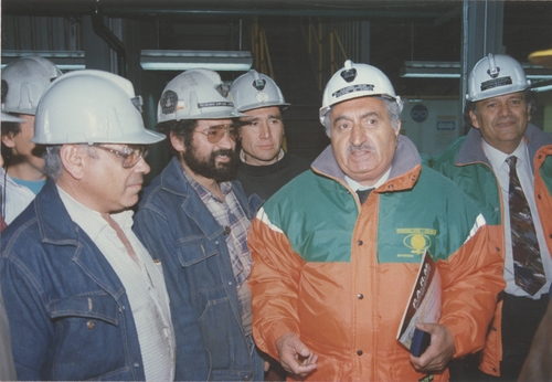 Alejandro Hales y Eduardo Frei Montalva rodeados por un grupo de mineros.