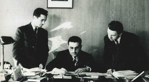 Alejandro Hales Jamarne junto a colaboradores en su despacho del ministerio de Agricultura. 1953