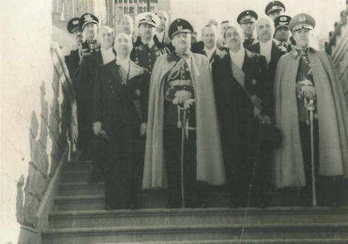 Alejandro Hales junto a la delegación chilena presente en la Transmisión de Mando de los presidentes bolivianos Víctor Paz Estenssoro a Hernán Siles Suazo. Imagen tomada en la residencia de la Embajada de Chile en Bolivia donde figura Benjamín Videla, ministro del Interior del Presidente Carlos Ibáñez del Campo. Por la importancia del acontecimiento todos visten tenidas de gala. 06 Agosto 1956