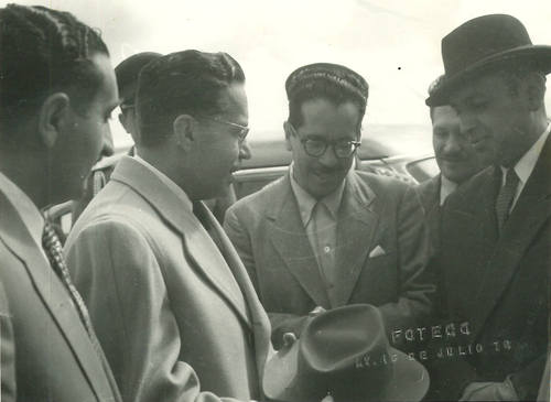 El embajador de Chile en Bolivia, Alejandro Hales, en compañía del Presidente boliviano Víctor Paz Estenssoro (1952-1956) y su vicepresidente, Hernán Siles Suazo en la ciudad de La Paz, Bolivia. 1958