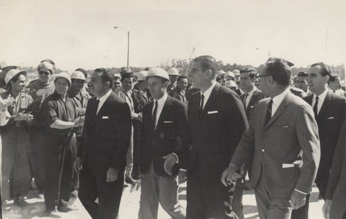 El Presidente de la República Eduardo Frei Montalva visita un mineral junto al ministro de Minería Alejandro Hales. Fecha aproximada. 1967