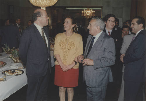 Reunión de despedida de Alejandro Hales de su cargo de presidente del Banco del Estado. En la foto junto al nuevo presidente, Andrés Sanfuentes, y la relacionadora pública del mismo, Ximena Tormo. 1992
