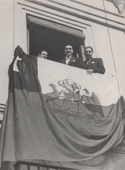 El ministro de Agricultura Alejandro Hales en el balcón del palacio de La Moneda durante las celebraciones del 21 de mayo. 21 Mayo 1954