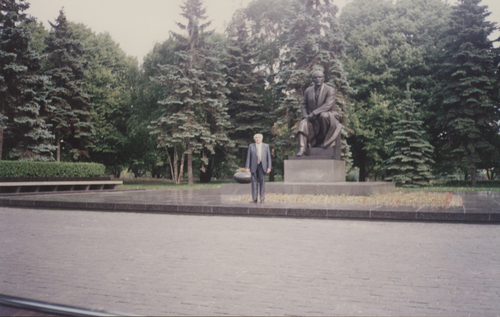 Alejandro Hales frente a la estatua de Vladimir Lenin en el Kremlin, Moscú. La estatua, obra del escultor soviético Veniamin Borisovich Pinchuk, fue trasladada al Museo V.I. Lenin en Gorki Leninskiye, -ciudad en la que falleció el líder soviético-, luego de la desaparición de la URSS. 1994