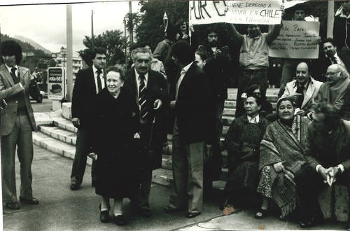 Acompañan a Alejandro Hales Josefina Larraín de Zaldivar, madre de los parlamentarios demócrata cristianos Andrés, Adolfo y Alberto Zaldívar. Además del doctor Manuel Almeyda, presidente del Movimiento Democrático Popular y Ana González, madre y dirigente de la Agrupación de Detenidos Desaparecidos. 1979