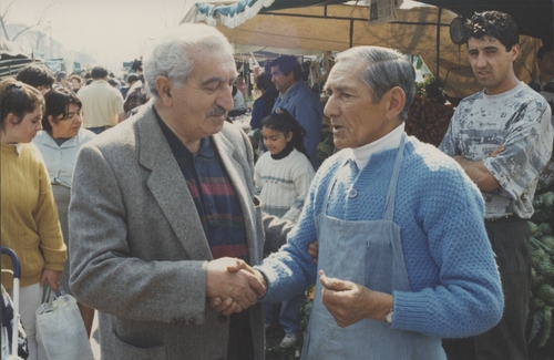 Fotografía de Alejandro Hales Jamarne junto a un feriante durante su campaña electoral para ser alcalde de la Municipalidad de Ñuñoa (1992). 1992