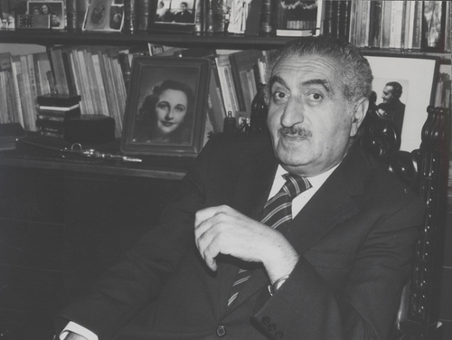 Alejandro Hales en su despacho. A su espalda, parte de su biblioteca y retratos familiares de su esposa Adela Dib e hijos. 1990