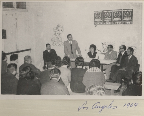 Alejandro Hales Jamarne en una reunión con dirigentes del Partido Democracia Agrario Laborista en la ciudad de Los Ángeles con motivo de la campaña presidencial a favor del candidato a la presidencia de la República, el democratacristiano Eduardo Frei Montalva. 1964