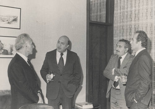 Reunión de autoridades y miembros de Fearab Chile y Fearab América en la que participan Reskala Tuma, vicepresidente Fearab América, Carlos Abumohor y Alejandro Hales Jamarne. 1990