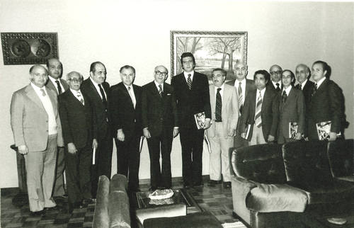 Alejandro Hales Jamarne junto a dirigentes de la Federación Americana de Entidades Árabes, entre ellos Víctor Ananías y Sabino Aguad, en la dependencias del Club Palestino. 1990