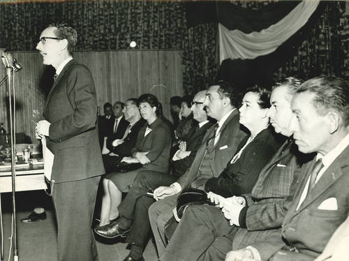 Discurso del presidente del Partido Demócrata Cristiano, el diputado Renán Fuentealba Moena, durante un acto de la campaña presidencial de Eduardo Frei Montalva. Lo observa Alejandro Hales Jamarne, dirigente de la campaña, sentado en primera fila. 1964