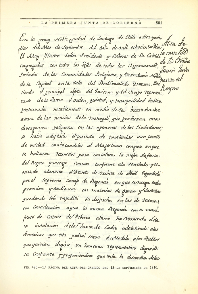 El Cabildo de Santiago llama a un Cabildo Abierto para el día 18 de septiembre de 1810, del que emana la formación de la Primera Junta de Gobierno. Y aunque sus miembros juran fidelidad y obediencia al soberano español, la instalación de esta corporación marca el inicio del proceso de independencia, pues desde entonces los sectores aristocráticos criollos ejercen en sus manos el poder político, lo que se considera una primera forma de autonomía política o de autogobierno respecto de España. El Presidente de esta corporación fue don Mateo de Toro y Zambrano.