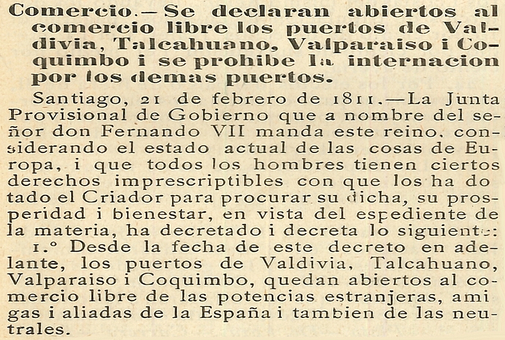 Por un decreto sancionado por la Primera Junta de Gobierno, se declara la libertad de comercio: “Desde esta fecha en adelante los puertos de Valdivia, Talcahuano, Valparaíso y Coquimbo quedan abiertos al comercio libre de las potencias extranjeras, amigas y aliadas de la España y también de las neutrales”, acabando así con el régimen comercial monopólico español.