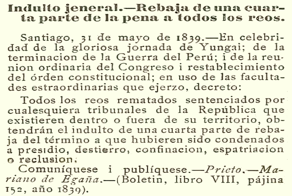 En conmemoración de la victoria chilena en la batalla de Yungay y el fin de la guerra con la Confederación Perú-boliviana, se decreta que todos los reos rematados sentenciados obtendrán el indulto de una cuarta parte de rebaja de sus condenas, sean ésta a presidio, destierro, confinación, expatriación o reclusión.