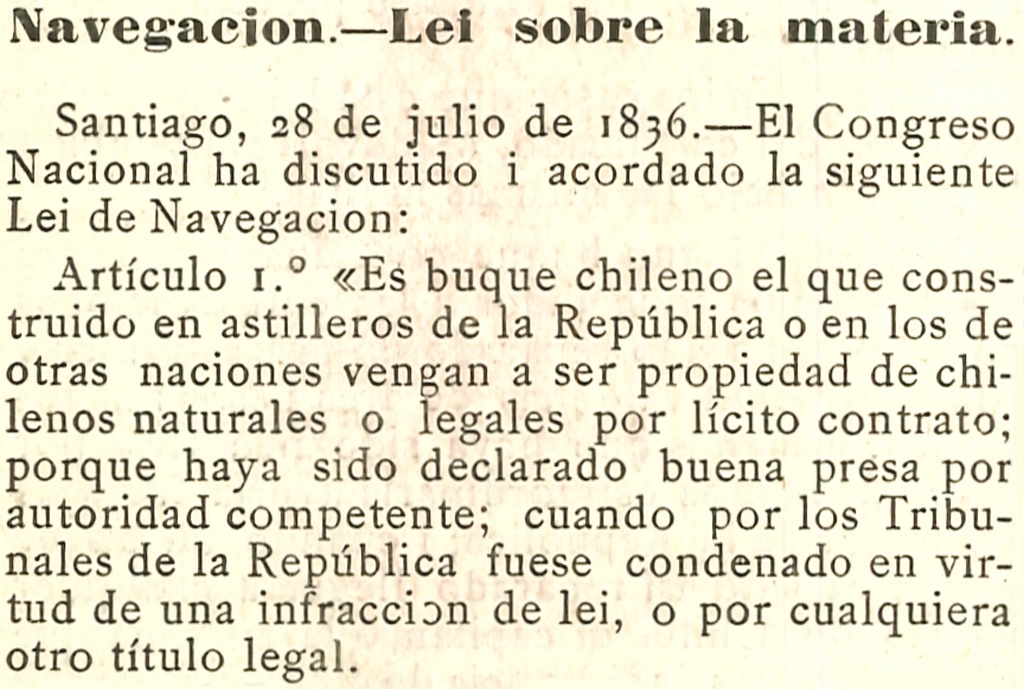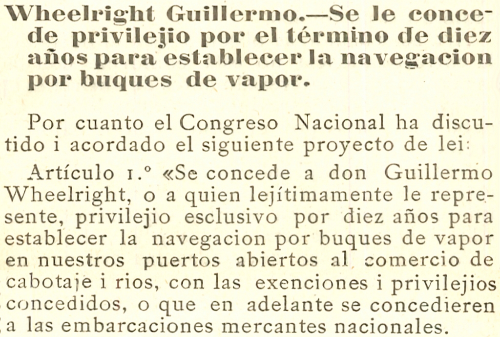Promulgada el 25 de agosto de 1835. El Congreso concede el privilegio por el término de diez años al señor Guillermo Wheelright para establecer la navegación con buques de vapor en nuestros puertos, con las exenciones y privilegios concedidos a las embarcaciones mercantes nacionales.