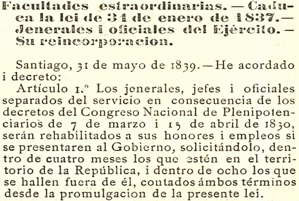 Decreto promulgado el 31 de mayo de 1839. Los generales, jefes y oficiales separados del servicio en el año 1830 tras la derrota liberal en Lircay, serán rehabilitados en sus honores y empleos. Declara, además, por el presente decreto, cerrado el uso de las facultades extraordinarias conferidas al Gobierno por la ley de 31 de enero de 1837.