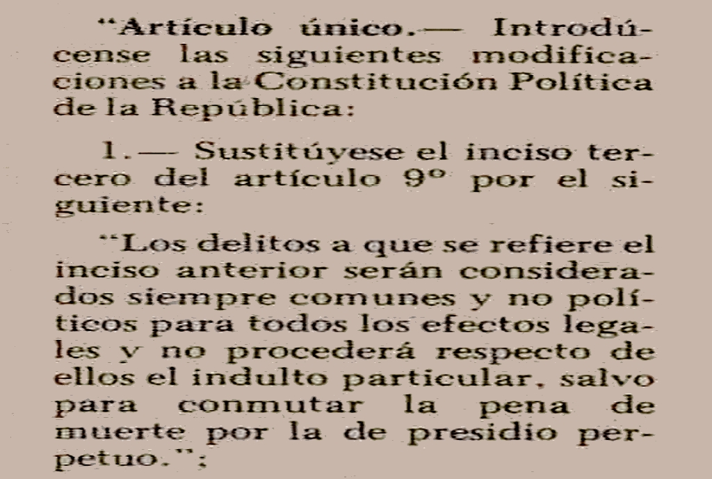 Ley N° 19.055, promulgada el 26 de marzo de 1991 y publicada en el Diario Oficial el 1 de abril de 1991. Modifica la Constitución Política de la República en materias de delitos políticos, libertad provisional y de indultos generales y amnistías.