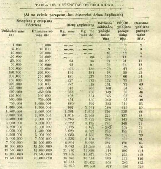 Artículo 35. Los polvorines o depósitos mencionados en el artículo anterior pueden ser permanentes o transitorios, en todo caso deben instalarse en despoblado y a las distancias mínimas señaladas por la siguiente tabla de seguridad para la cantidad de explosivos establecida en ella: