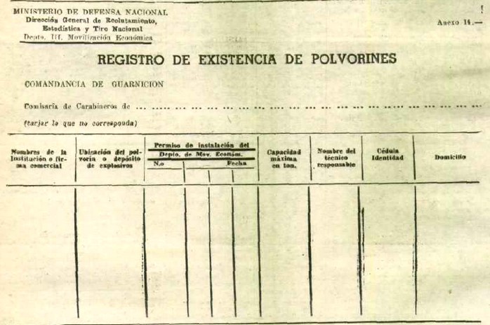Una vez autorizada la instalación por el Departamento de Movilización Económica, se procederá a hacer la inscripción correspondiente de "Existencia de Polvorines" (Anexo 14) ante la autoridad fiscalizadora correspondiente (Art. 5.o).