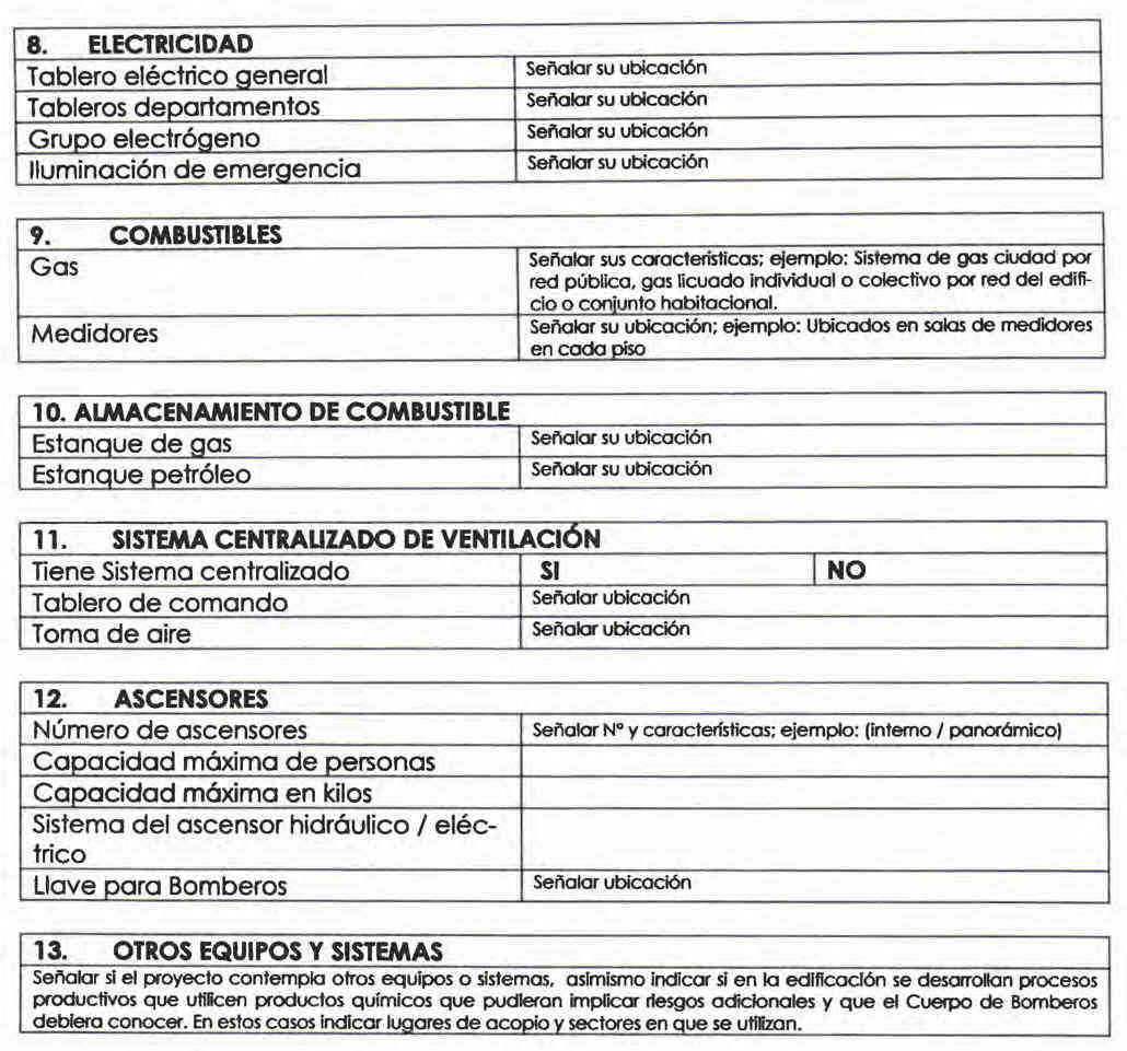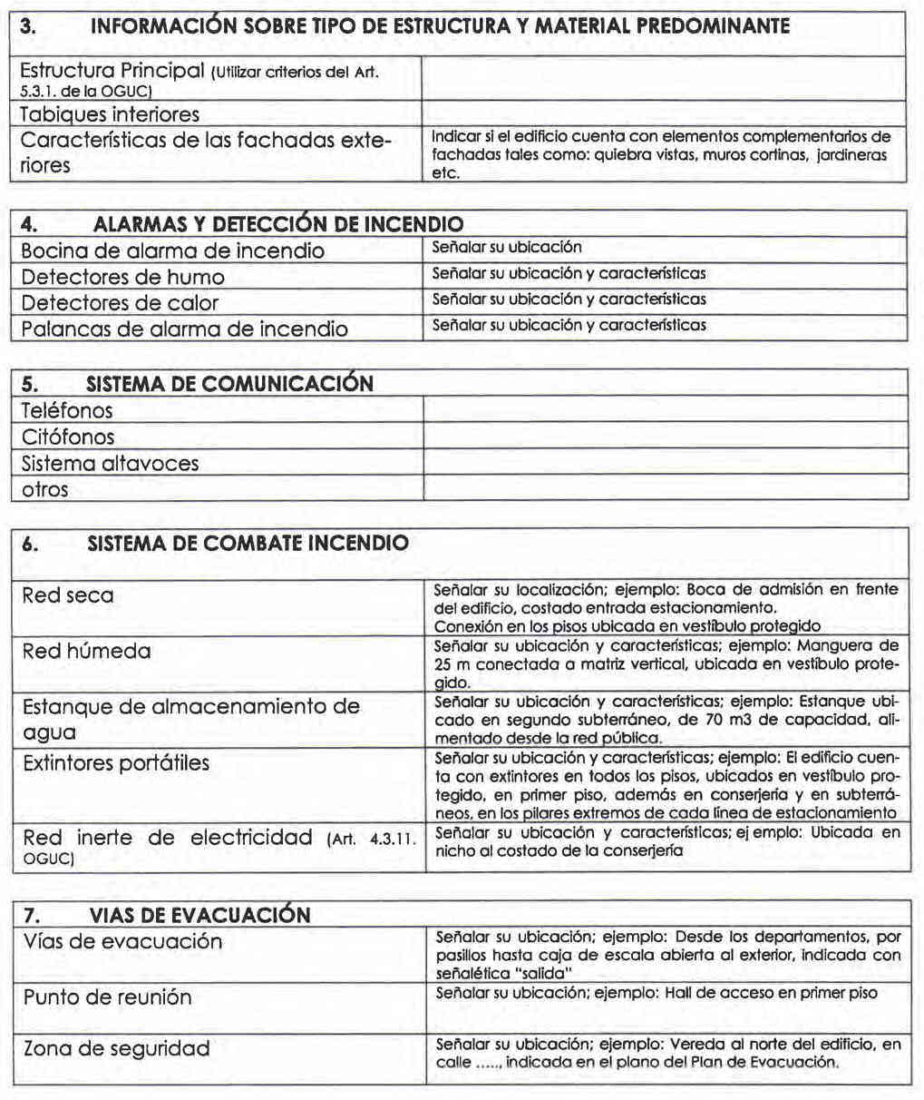 En la ficha técnica, se entregará la información relevante respecto de la edificación - tales como, características constructivas, elementos y equipos con que cuenta el edificio que el Cuerpo de Bomberos y los ocupantes de un edificio deben conocer para detectar y combatir una emergencia. Esta ficha será complementada con los planos del edificio y la Guía Práctica de Evacuación para los ocupantes.