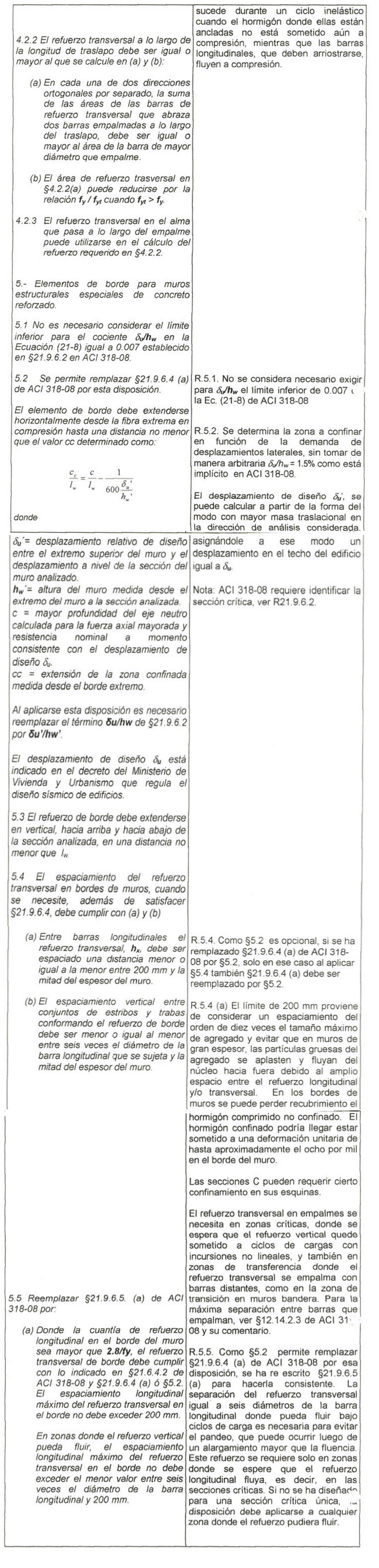 4.- Que como resultado de las reuniones sostenidas por el Panel de Expertos se determinó que es urgente y necesario fijar aspectos especiales para el Hormigón Armado - Requisitos de diseño y cálculo, para su aplicación hasta que el Instituto Nacional de Normalización confeccione la norma técnica correspondiente y ésta sea declarada Norma Oficial de la República de Chile por decreto supremo del Ministerio de Vivienda y Urbanismo, dicto el siguiente