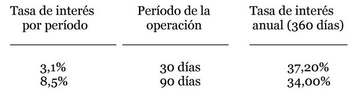 a) La tasa de interés que corresponde a operaciones tanto de colocaciones como de captaciones, reajustables y no reajustables, deberá considerar siempre el interés de cobro vencido y expresarse en términos anuales siendo facultativo indicar la correspondiente al período a que esté referida la operación (30, 40, 60, 90 días, etc.).