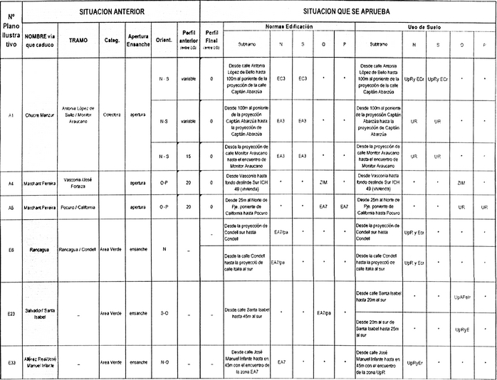1.- Apruébanse y promúlganse las nuevas normas urbanísticas asignadas a los ensanches y aperturas, cuya declaratoria a utilidad pública caducaron el 13 de febrero de 2012, asimilándolas a las Zonas de Uso de Suelo y Edificación predominantes de las adyacentes al terreno, de acuerdo a lo señalado en los cuadros que se grafican a continuación: