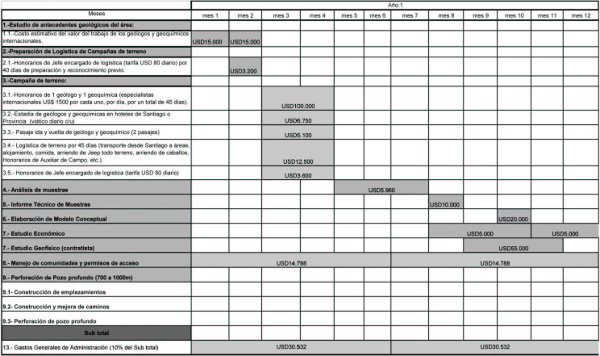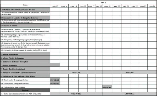 Artículo Segundo: Antecedentes Generales, Técnicos y Económicos del Proyecto: El trabajo que se debe llevar a cabo dentro del área de la presente concesión consiste en un conjunto de actividades de orden secuencial conducentes a determinar la viabilidad técnica y económica del proyecto. Los resultados obtenidos en cada una de las fases condicionan el paso a la fase siguiente y las acciones a seguir. Todo esto, en orden a poder finalizar las actividades de exploración propuestas dentro de los dos años de vigencia de la concesión para determinar la existencia de un recurso geotermal benigno, sus límites, tamaño y ubicación de los lugares de mayor interés para perforar (upflow y outflow), así como la viabilidad económica del proyecto. Los trabajos específicos a realizar por la concesionaria comprenderán un estudio geológico del área incluyendo geología regional y de detalle mediante fotogeología, imágenes satelitales, toma de muestras, estudio de centros volcánicos y estudio de estructuras geológicas referente a fallas y plieges. También, se realizará un estudio de geoquímica de las aguas mediante el muestreo de fluidos de agua y gas para su correspondiente análisis de cationes, aniones, isótopos, pH, temperatura, TDS, entre otros. Posteriormente, se realizarán los estudios de geotermometría, de Giggenbach Fournier, sílica y grillas de gases para determinar las temperaturas en subsuperficie. Igualmente, se realizará una campaña geofísica de detalle con el fin de determinar las áreas de alta conductividad y de alta resistividad para determinar la extensión de la capa sello y profundidad del reservorio. Con todos los antecedentes se construirá un modelo conceptual con el fin de determinar los puntos de perforación para la segunda fase del proyecto. En base a los trabajos antes mencionados, la concesionaria intentará determinar la existencia de un reservorio geotermal, así como su posible extensión y potencial económico. Asimismo, se determinarán los puntos de perforación profunda para un pozo delgado de al menos setecientos metros que permita validar el modelo. Todo lo anterior, tiene como fin último el descubrir un recurso geotérmico para la generación de energía eléctrica, que sea viable de ser explotado comercialmente.