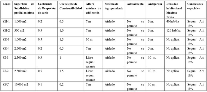 ARTICULO 19.- Normas específicas: Las condiciones de subdivisión predial y de edificación para las zonas establecidas en el artículo 17, serán las siguientes:Resolución 110