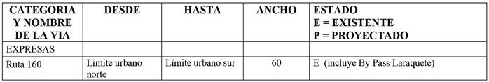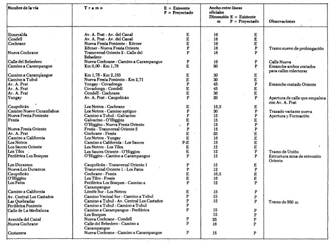 ARTICULO 22. - La estructura vial urbana estará conformada por las calles existentes y proyectadas que se definen como vías estructurantes y que figuran en el cuadro siguiente, donde se indican los tramos y el ancho establecido entre líneas oficiales.