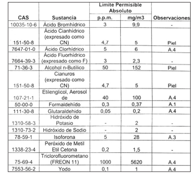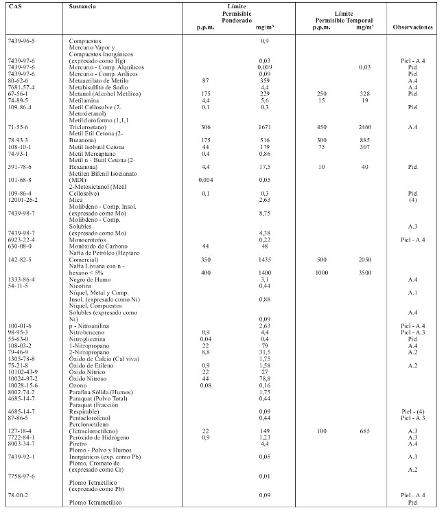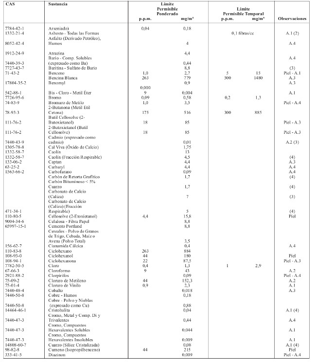 11.- Reemplácese la tabla relativa a los Límites Permisibles Absolutos, contenida en el artículo 61, por la siguiente:
