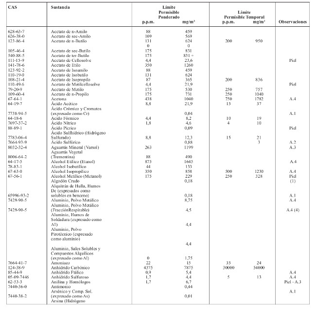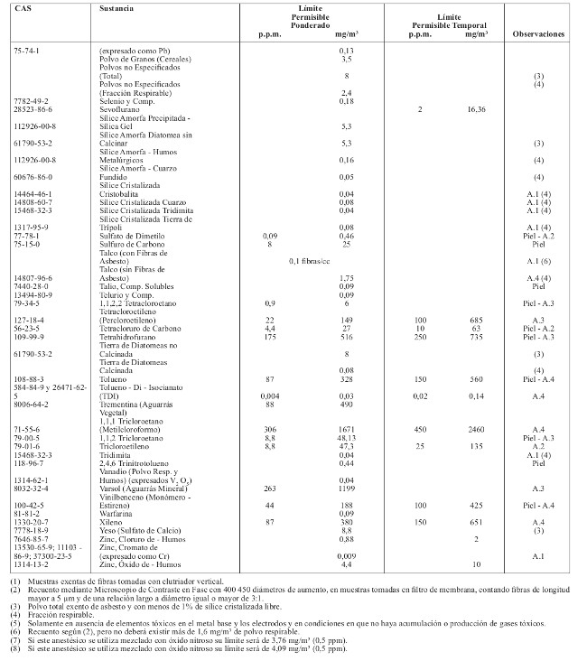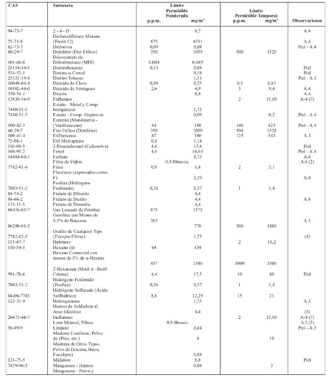 15.- Reemplácese la tabla relativa a los Límites Permisibles Ponderados y Límites Permisibles Temporales, contenida en el artículo 66, por la siguiente:
