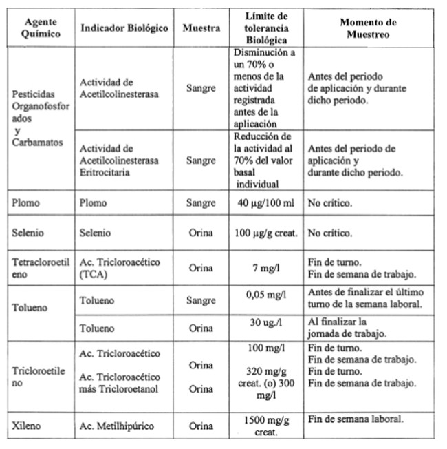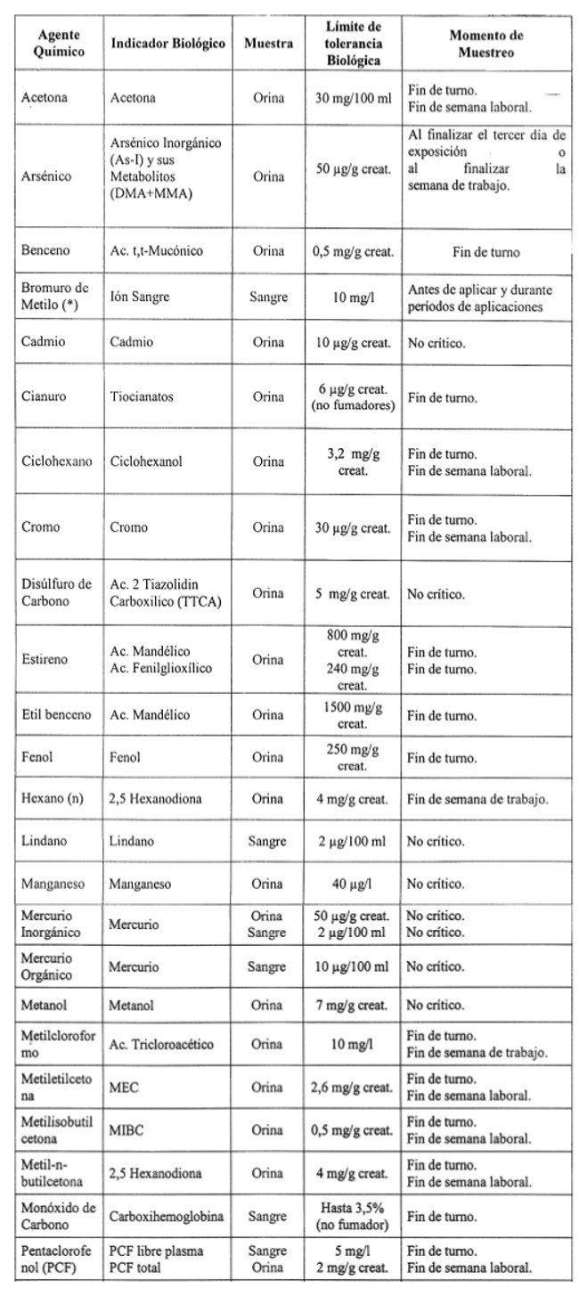 . 16.- Reemplácese la tabla relativa a los Límites de Tolerancia Biológica, contenida en el artículo 113, por la siguiente: