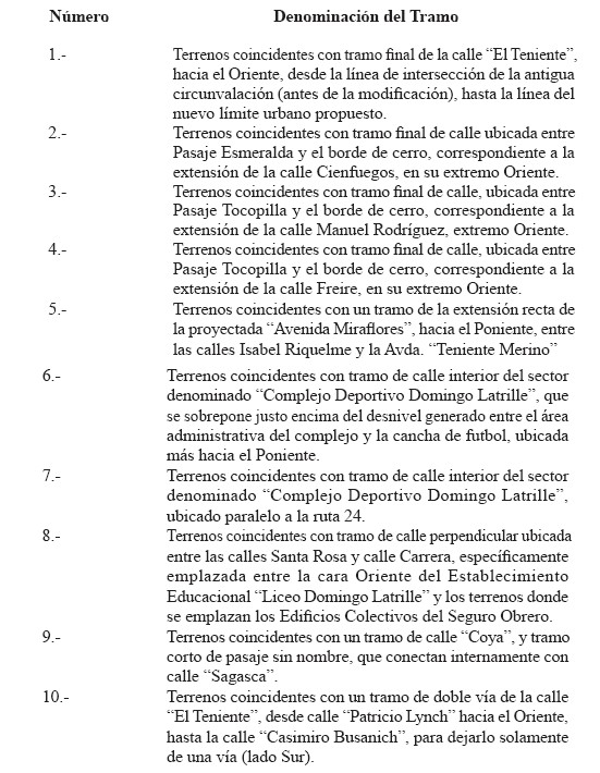 1.-  Apruébase la siguiente nómina de terrenos, de la comuna de Tocopilla, coincidentes con circulaciones, cuyas declaratorias de utilidad pública se dejan sin efecto: