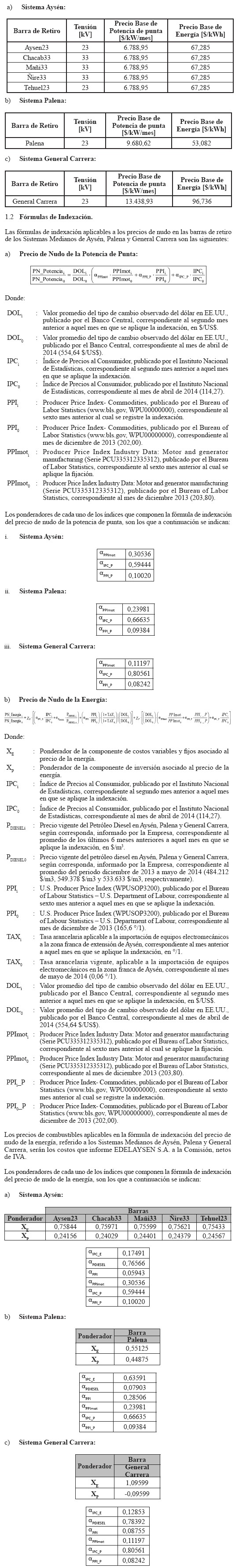 Artículo primero: Fíjanse los siguientes precios a nivel de generación y transmisión, en adelante "precios de nudo", sus fórmulas de indexación y las condiciones de aplicación de los mismos, para los suministros de electricidad a que se refiere el artículo 174° y siguientes de la Ley, que se efectúen en los Sistemas Medianos de Aysén, Palena y General Carrera. Estos precios se aplicarán desde la publicación del presente decreto en el Diario Oficial, sin perjuicio de su entrada en vigencia a contar del 1° de noviembre de 2014, conforme a lo dispuesto en el artículo 178° de la Ley, para efectos de las reliquidaciones señaladas en el inciso cuarto del mismo artículo.