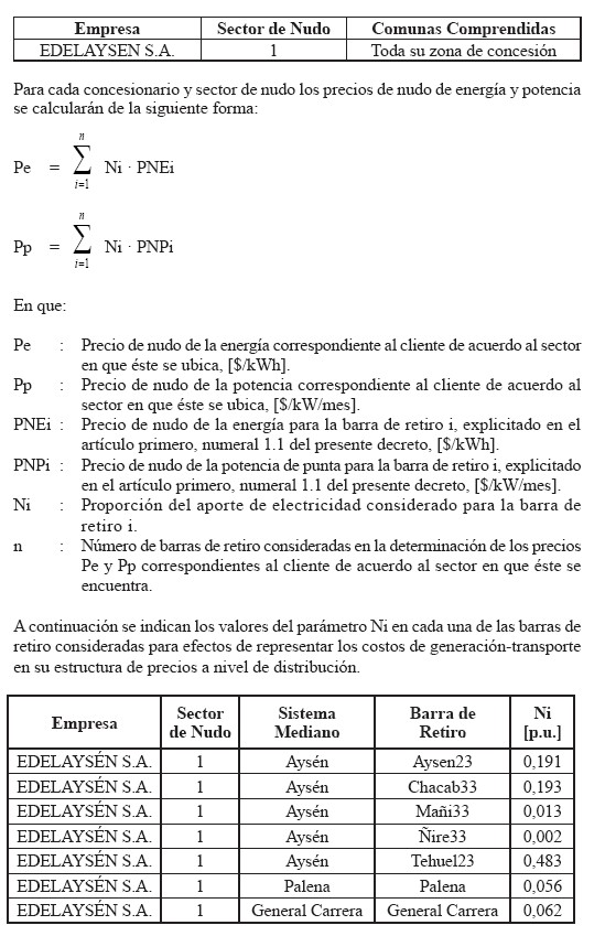 Para efecto de la determinación de los precios de nudo a utilizar en las fórmulas tarifarias de concesionarios de servicio público de distribución, según lo establecido en el Decreto Supremo Nº 1T de 2012, del Ministerio de Energía o el que lo reemplace, se considerarán los precios que resultan de aplicar las siguientes fórmulas, para cada concesionario y sector de nudo en donde se ubica el cliente de la empresa concesionaria, considerando la siguiente clasificación: