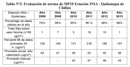 De acuerdo a esta evaluación, en la cual se observa que el percentil 98 está por sobre el límite establecido de 150 µg/m³, en la estación INIA - Quilamapu , en todos los años monitoreados, se verifica que la norma primaria de calidad ambiental diaria de MP10 se encuentra sobrepasada en su métrica diaria.