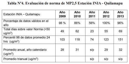 De acuerdo a esta evaluación, en la cual se observa que el percentil 98 está por sobre el límite establecido de 50 µg/m3 , en la estación INIA - Quilamapu de Chillán, en todos los años monitoreados, se verifica que la norma primaria de calidad ambiental diaria de MP2,5 se encuentra sobrepasada.