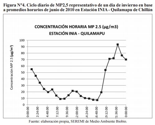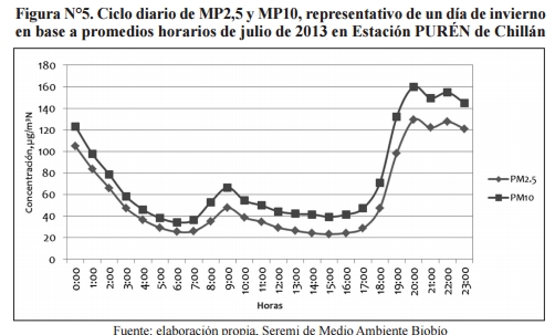 . Este marcado ciclo se explica por dos condiciones, primero, se acentúan en horas de la tarde y noche las condiciones meteorológicas que desfavorecen la dispersión de los contaminantes (mala ventilación, bajas temperaturas, inversión térmica, altas presiones, etc.), y segundo, porque aumentan las emisiones de material particulado MP10 y MP2,5 en el área, ya que en esas horas se incrementa el uso de leña para calefacción domiciliaria, por un lado, porque las familias regresan a sus hogares y encienden la calefacción, y por otro, porque bajan considerablemente las temperaturas.
