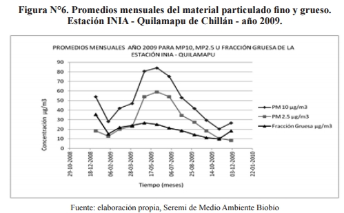 Dado que el comportamiento, tanto de MP2,5 y de MP10, presenta una marcada estacionalidad, se presenta a continuación el MP10, MP2,5 y la fracción gruesa, para el año 2009 en la estación INIA - Quilamapu de Chillán. Se observa que lo que varía durante el año y aumenta considerablemente en los meses de otoño e invierno, es la fracción fina.