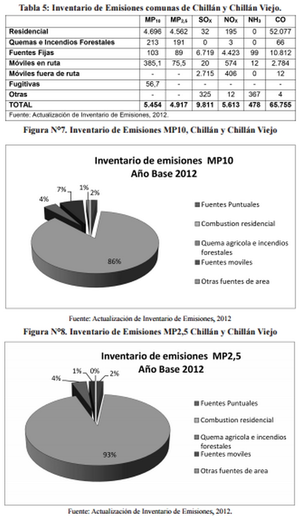 . El total de emisiones de MP2,5 generadas por el uso de leña como combustible en las viviendas de Chillán y Chillán Viejo asciende a una cantidad estimada de 4.917 ton/año, y respecto al MP10 asciende a una cantidad estimada de 5.454 ton/año (ambas cifras año base 2012).