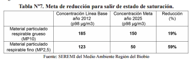 Dado que un gran porcentaje del MP2,5 generado por la combustión residencial de leña está contenido en el MP10, el cumplimiento de la norma de MP2,5 implicará el cumplimiento de la norma de MP10. Por esta razón, la meta del Plan dice relación con disminuir las concentraciones diarias de MP2,5 hasta valores que se encuentren por debajo de los niveles considerados de saturación, de tal forma de dar cumplimiento a dicha normativa y consecuentemente dar cumplimiento a la normativa de MP10.