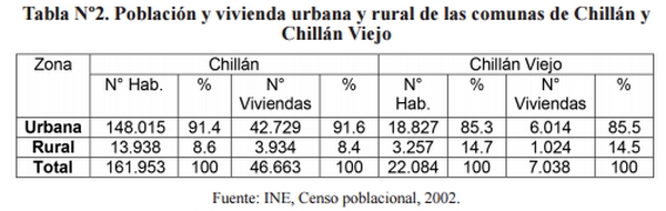 . Como se observa en la tabla Nº2 la comuna de Chillán posee la mayor parte de su población concentrada en el área urbana, alcanzando un 91,4% del total. Por otra parte, la comuna de Chillán Viejo alcanza un 85,3% de población urbana. Producto del aumento poblacional y el desarrollo de nuevas áreas urbanas, se tiene un creciente uso de recursos energéticos con la finalidad de calefacción residencial, que en el caso puntual de Chillán y Chillán Viejo, es preferentemente el combustible leña.