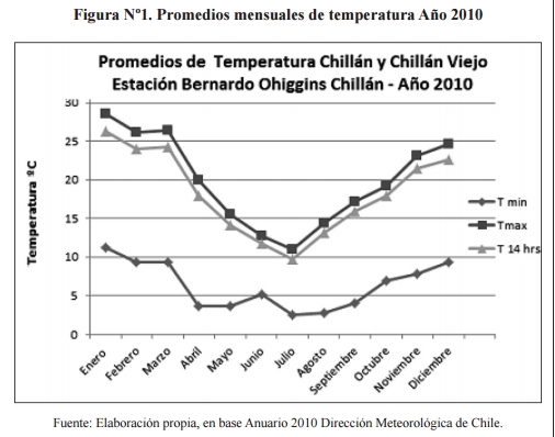 Las comunas de Chillán y Chillán Viejo se caracterizan por un tipo de clima templado cálido mediterráneo con estación seca en los meses de verano y lluviosa en los meses de invierno. La temperatura media para un año normal es de 13,05 °C y precipitaciones de más de 1.000 mm.2
