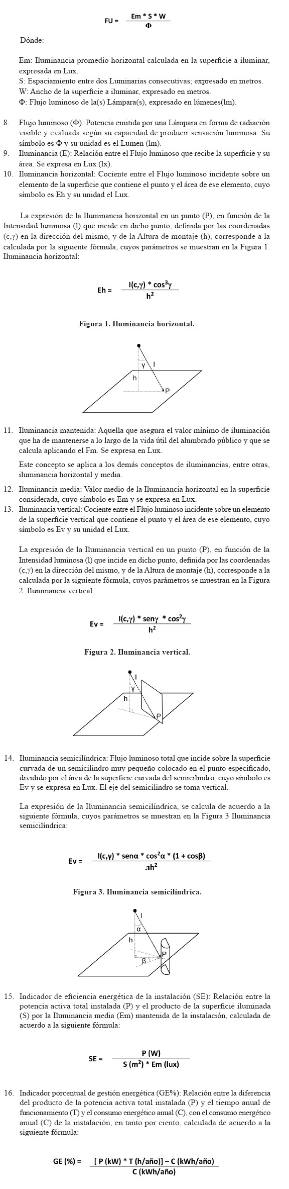 7.  Factor de utilización (FU): Relación entre el Flujo luminoso procedente de la Luminaria que llega efectivamente a la superficie a iluminar y el Flujo luminoso emitido por una Lámpara instalada en la Luminaria, el que corresponde a la calculada por la siguiente fórmula:
